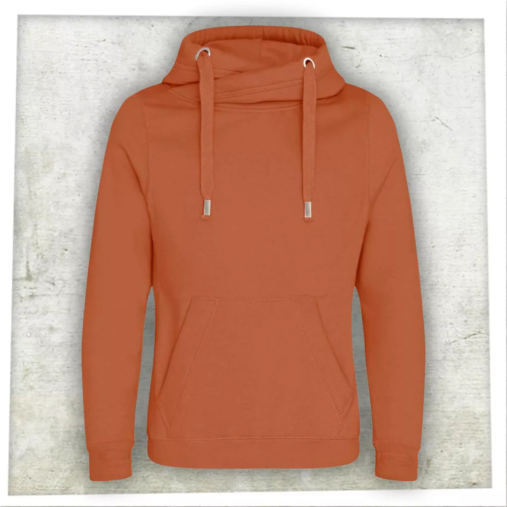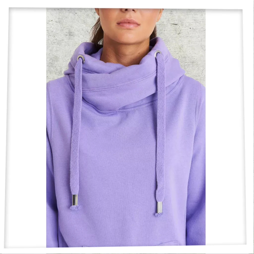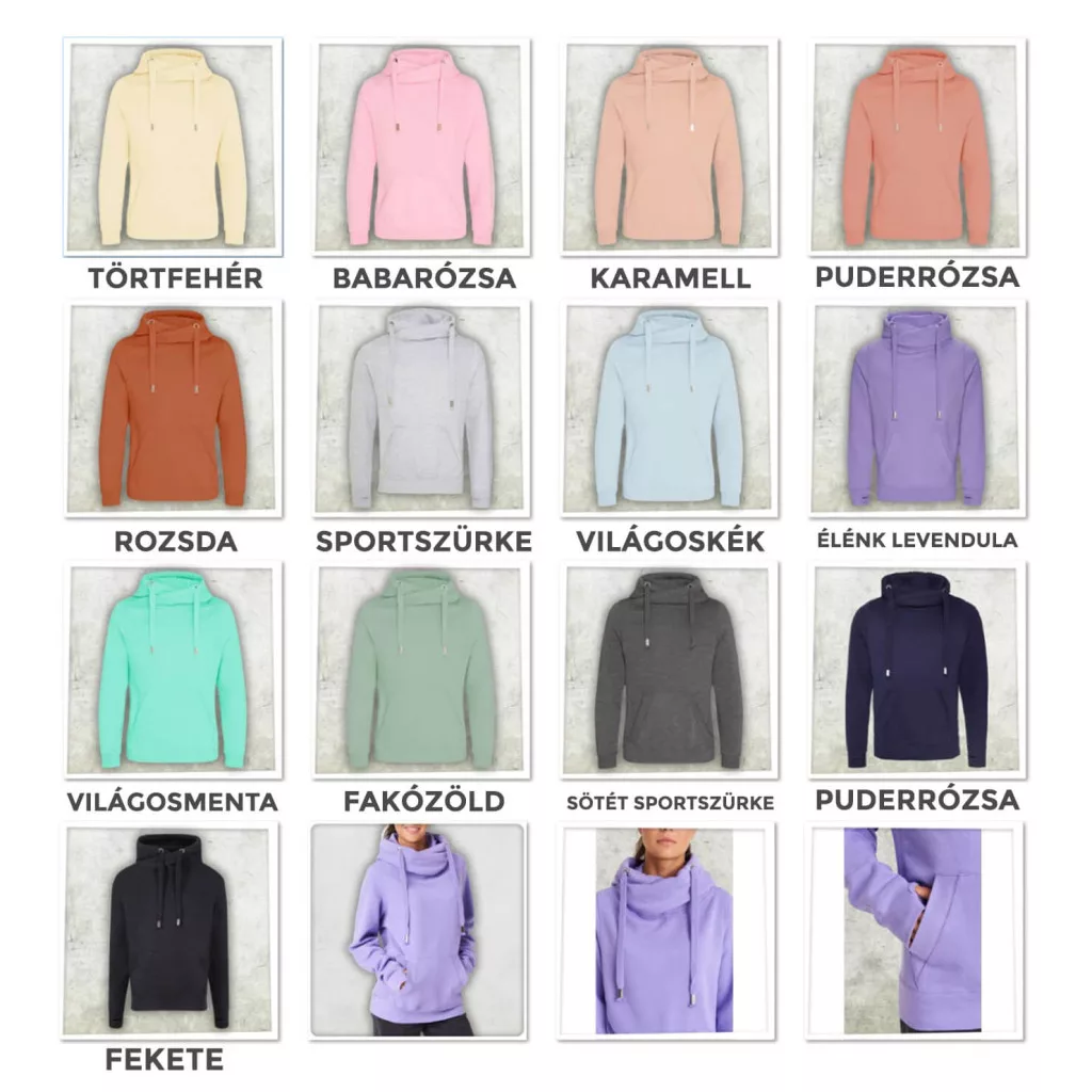330 g/m2-os, extra meleg női kapucnis pulóvereink dupla anyagú kapucnival készültek, keresztpántos nyakkiképzése egyedi megjelenést biztosít.