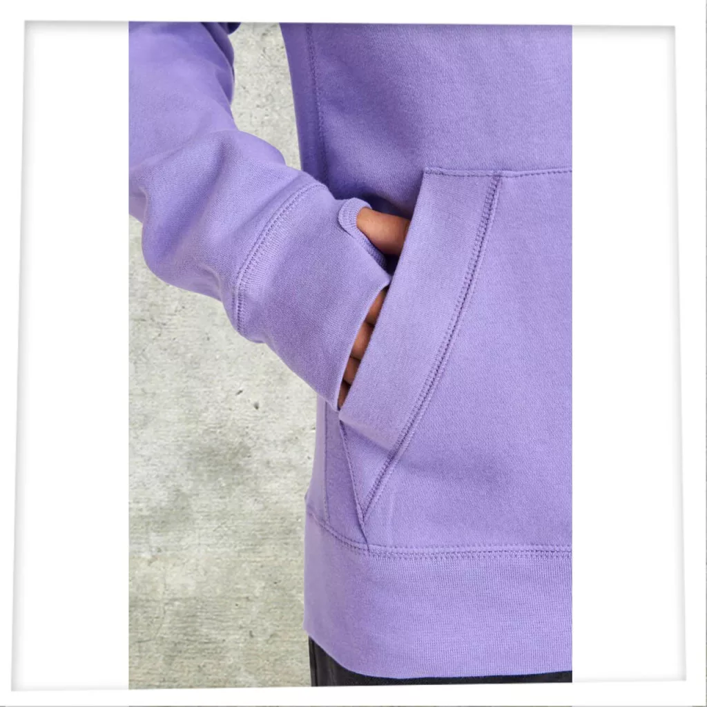 Praktikus kenguruzseb, lapos húzózsinór, bolyhozott belsővel, bordázott mandzsettáján nyílással a hüvelykujj számára.Klasszikus, hagyományos szabású, kényelmes viselet.